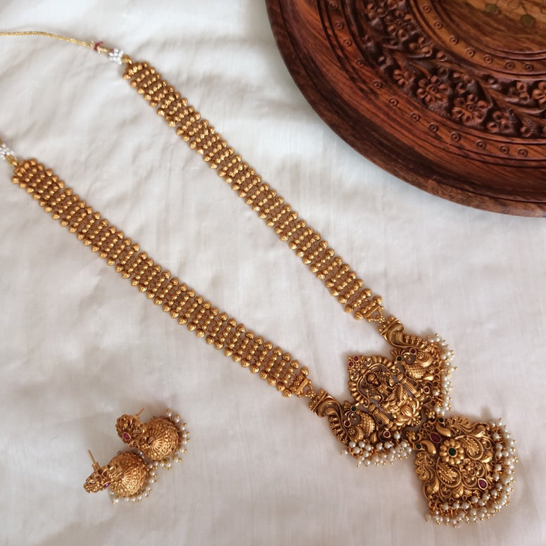 Matte finish temple design with cluster pearls long haram & jumka